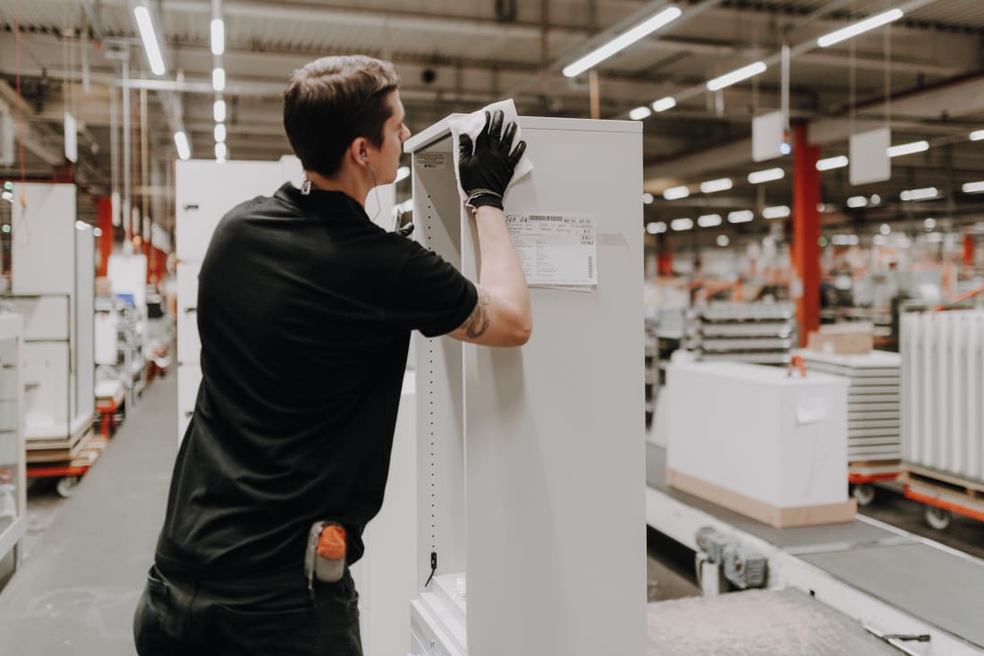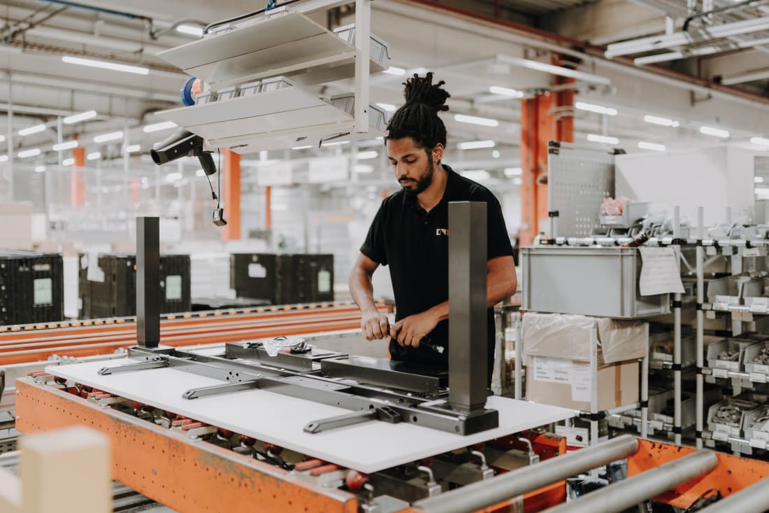 In all unseren Fertigungsschritten gilt der Leitsatz Made in Germany. Dafür verfügt unser Standort auf rund 90.000 Quadratmetern über alle benötigten Fertigungskompetenzen: Holz- und Metallbearbeitung, Stoffzuschnitt, Näherei und Endmontage, ausgerichtet nach Lean-Prinzipien und unterstützt von zahlreichen digitalen Prozessen wie zum Beispiel einem vollautomatischen Hochregallager oder kollaborierenden Cobots.