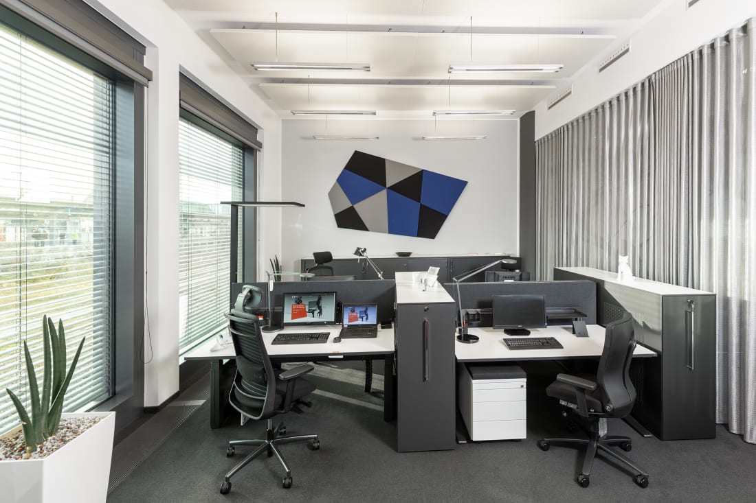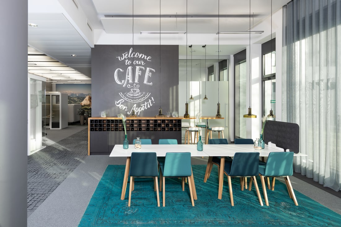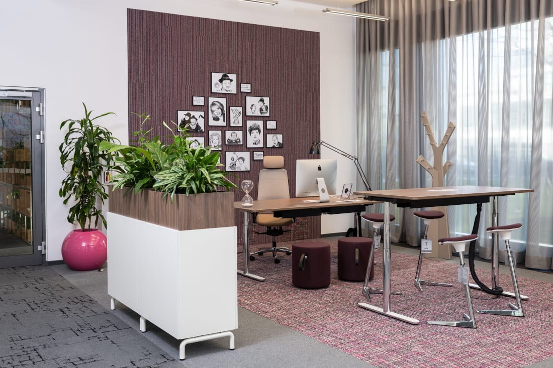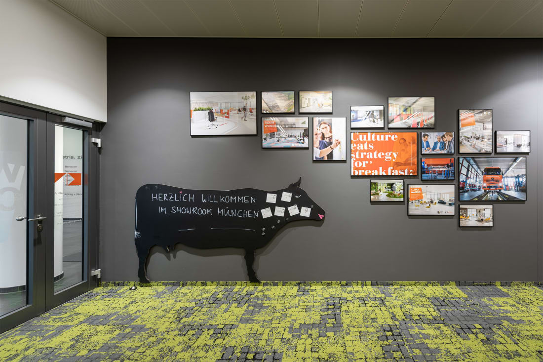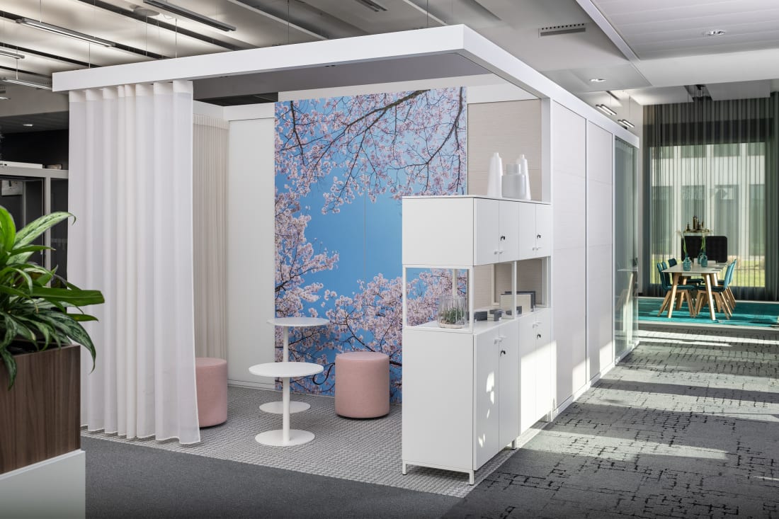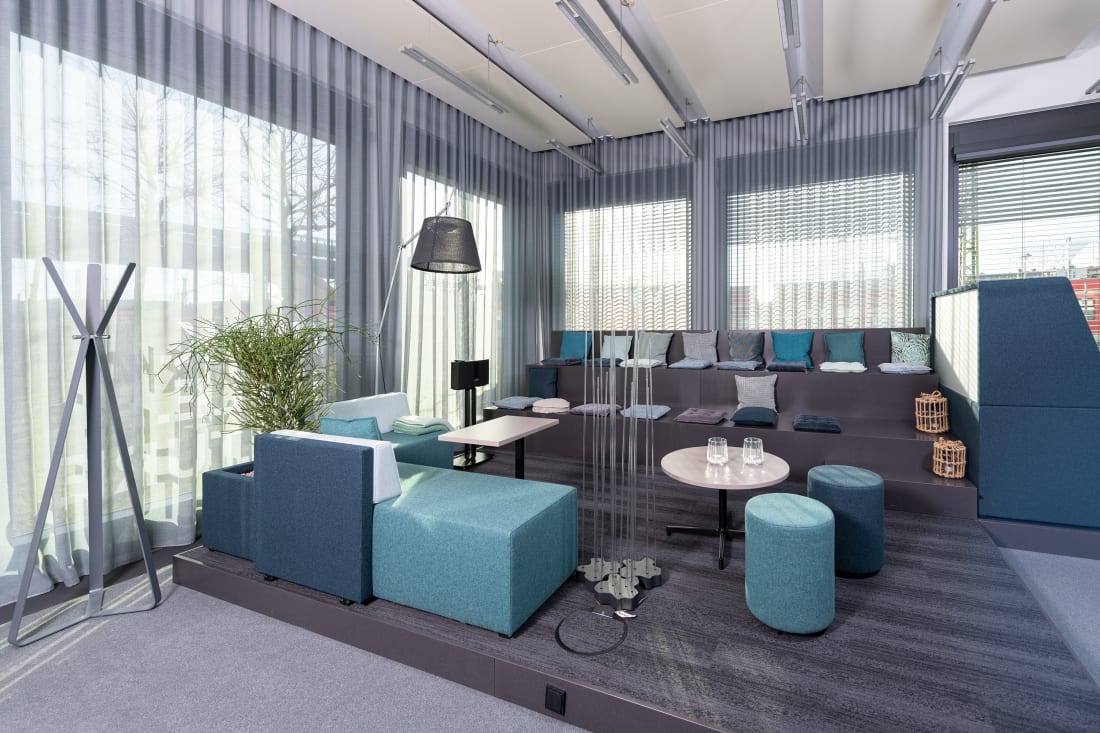 Gemeinsam mit Kooperationspartnern wie Artemide, Interface und Création Baumann wurde eine einladende Atmosphäre gestaltet. Entdecken Sie, welche Lösung zu Ihrer individuellen Arbeitskultur passt: Lösungen für Teamarbeit, fokussiertes Arbeiten oder verschiedene Kommunikations- und Besprechungsszenarien geben Impulse für die Neu- oder Umgestaltung Ihrer Büroräume. Die großzügige Werkbank lädt ein mit Stoffen, Farben und Materialien zu experimentieren und mit Hilfe unserer Stilwelten die passende Kombination für Ihre Anforderungen zu finden.