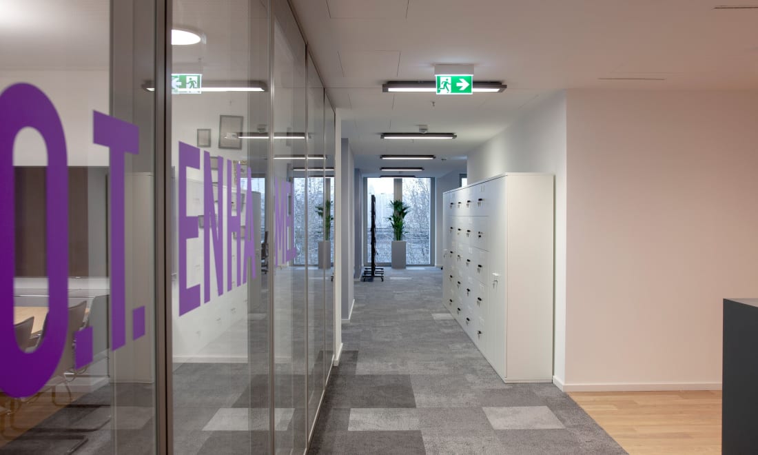 With our high-quality furniture, we support the dynamic working methods of the flexibly working teams: the TALO.S motorised desk enables a quick change of working position, while the OKAY.III office chair with its movable backrest optimally supports the back and at the same time encourages the users to keep moving. The ACTA.PLUS lockers not only offer secure storage options, but also function as a meeting point with colleagues during check-in and check-out.