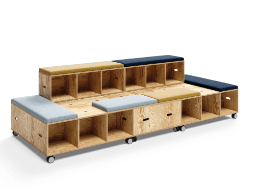 The open modules double up as storage spaces. They feature recessed handles on each side for easier reconfiguration.