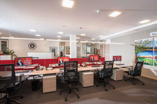 De eerste plek die men ziet is de open gevormde klantenhal met de servicepoints. De spaarbank besloot bewust om de zelfbedieningsterminals weer in het dagelijkse zakenleven te integreren, om te voorkomen dat de klant zich hiervan zou vervreemden. De advieskamer in de benedenverdieping en de 1ste bovenverdieping zijn typisch voor de regio, praktisch aangenaam gevormd. “Het concept”, zegt Neumaier, “is gebaseerd op een duidelijke scheiding van werkplekken en klantenruimtes”.“