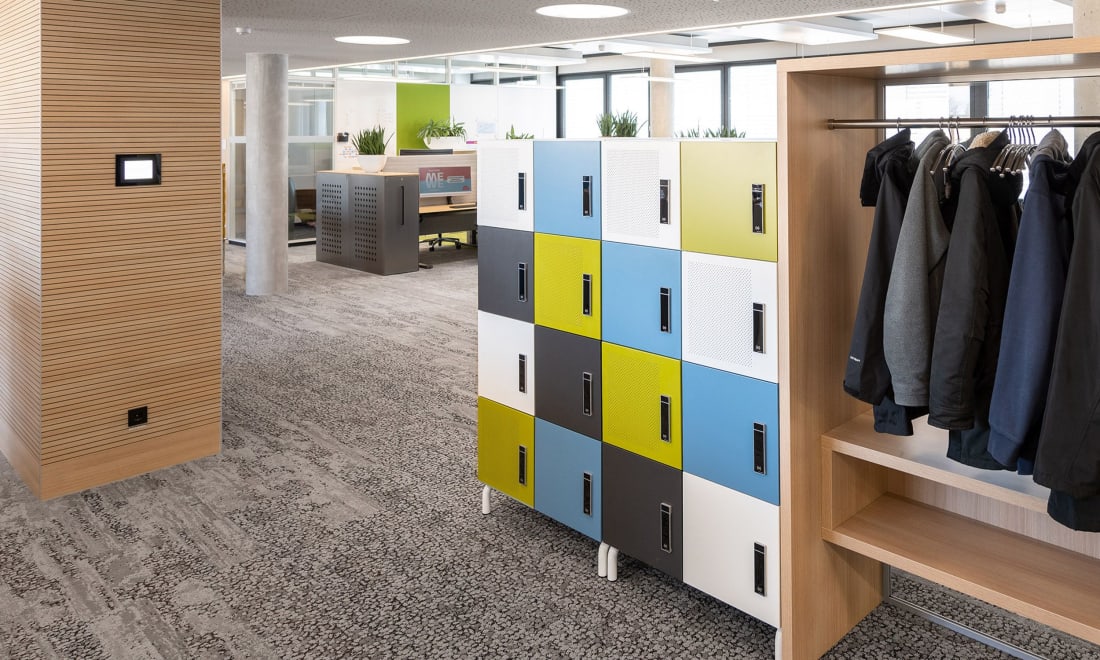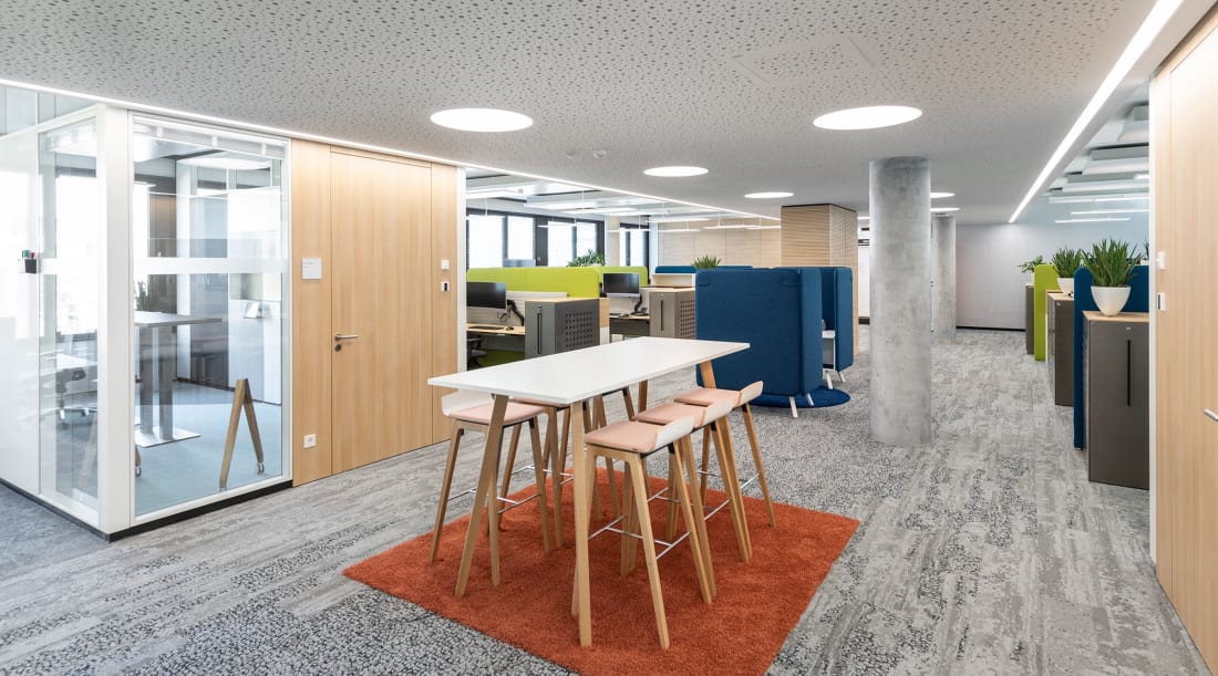 Het grondoppervlak van 27.400 vierkante meter wilde men ongewijzigd laten, aldus Matthias Kraus, afdelingshoofd Facilitair management, “zodat we geen extra vloerbedekking hoefden te leggen.” Het eerste deel van drie bouwfasen is nu klaar. De heldere vormen van het gebouw van zes verdiepingen, waarin veel glas zorgt voor optimale lichtomstandigheden, contrasteert met een bewuste combinatie van kleuren, vormen en materialen in het interieur. Als partner voor de nieuwe meubelconcepten koos men, evenals in het verleden, voor König + Neurath. “Wij gebruiken al heel lang K+N meubilair en zijn overtuigd van de kwaliteit, de flexibiliteit van de speciale opties en de prijs-kwaliteitverhouding”, aldus Kraus.