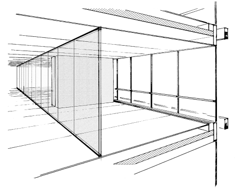 Overdracht van de frameloze glasarchitectuur op de ruimtestructuur, optimale geluidsisolatie tot 45 dB bij geringe wanddikte.